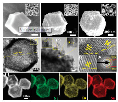 Synthetic ZIF-67 and fresh NaHSe solution were used as precursors and selenium sources to prepare Ni-Co-Se nano-polyhedrons by cation exchange and sacrificial template method. In detail, 74 mg ZIF-67 powder was ultrasonically dispersed into 50 mL 0.01 mol/L Ni(NO3)2·6H2O alcohol solution. The mixture was continuously stirred for 30 min, then the precipitate was collected by centrifugation and dried in a vacuum of 60 ℃ for 12 h. After that, the resulting product was dispersed into 35 mL of deionized water, and the 5 mL 0.5 mol/L NaHSe solution was added and stirring was continued for 30 min to obtain a dark gray solution, which was then transferred to a 50 mL stainless steel autoclave. The reaction equipment is maintained at 100 ℃ for 6 h, followed by naturally cooling to ambient temperature. Finally, the precipitate was cleaned with alcohol and DI water and dried in a vacuum of 60 ℃ to obtain Ni-Co-Se nano-polyhedrons. To serve as experimental control, the Co-Se and Ni-Co-O nano-polyhedrons were synthesized via removing the procedure of adding Ni(NO3)2 6H2O and annealing cation exchange products directly in air (300 ℃, 3 h), respectively.