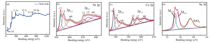 To further investigate element compositions and chemistry states of Ni-Co-Se, XPS analyses are performed. The full-survey XPS spectrum of Ni-Co-Se exhibited in Fig. 3a demonstrates the coexist of C, O, Co, Ni and Se elements, which are consistent with conclusions of XRD and EDS. The Ni 2p spectrum in Fig. 3b can be accurately fitted with two spin-orbit splittings of Ni 2p3/2 and Ni 2p1/2 accompanied by two concomitant shakeup satellites (indicated as "sat."), among which the fitting peaks with binding energies of 853.3/871.3, 855.6/874.7 and 860.5/879.5 eV, are assigned to Ni2+ and Ni3+, respectively [16, 41]. Similarly, the Co 2p in Fig. 3c, can be accurately fitted with two spin-orbit splitting of Co 2p3/2 and Co 2p1/2, where the fitting peaks with binding energies of 778.6/780.6, 793.6/797.0, and 784.7/802.1 eV are indexed to the characteristics of Co3+, Co2+ and two "sat." signals, respectively [41, 42]. The Se 3d spectrum of Ni-Co-Se are depicted in Fig. 3d, in which peaks at around 54.5 and 55.2 eV can be associated with Se 3d3/2 and Se 3d5/2 in low coordination and Metal-Se (Co-Se/Ni-Se) bonds. The peak with binding energies at 59.0 eV corresponds to SeOx, which is originated from partial oxidation [42-44].