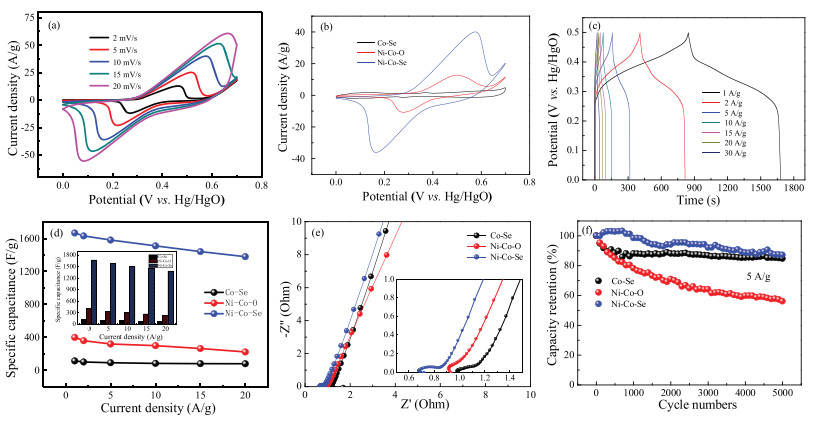 Figure 4 (a) CV curves of the Ni-Co-Se electrode at different scanning rates from 2 mV/s to 20 mV/s. (b) CV curves of Co-Se, Ni-Co-O and Ni-Co-Se at 10 mV/s. (c) GCD curves of Ni-Co-Se electrode at different current densities from 1 A/g to 30 A/g. (d) Specific capacitances of Co-Se, Ni-Co-O and Ni-Co-Se. (e) EIS of Co-Se, Ni-Co-O and Ni-Co-Se. (f) Cycling performance of Co-Se, Ni-Co-O and Ni-Co-Se at the current density of 5 A/g.
