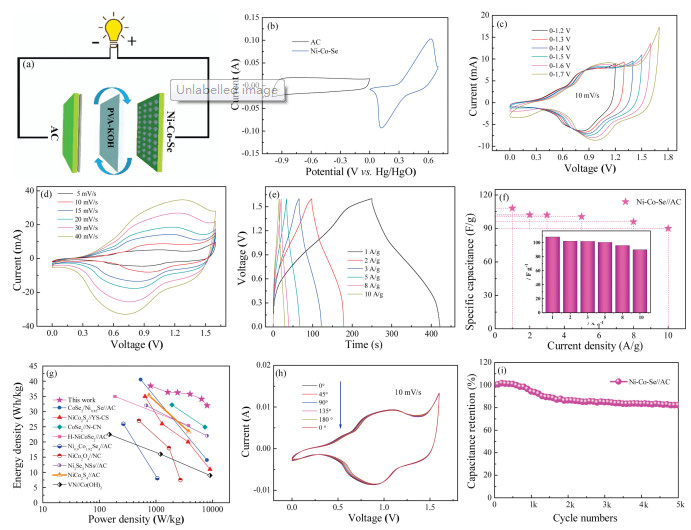 Figure 5 (a) Schematic illustration of the hybrid supercapacitor based on Ni-Co-Se as the positive electrode and AC as the negative electrode. (b) CV curves of the AC and Ni-Co-Se at 15 mV/s based on three electrode configurations. (c) CV curves of the as-assembled Ni-Co-Se//AC hybrid supercapacitor at 10 mV/s ranging from 1.2 to 1.7 V. (d) CV curves of the as-assembled hybrid supercapacitor with different scan rates in the voltage window of 0–1.6 V. (e) GCD curves of the as-assembled hybrid supercapacitor at different current densities. (f) The corresponding specific capacitances at different current densities. (g) Ragone plot of the as-assembled supercapacitor. (h) The capacitance retention different bending angles at a current density of 10 mV/s. (i) Cycling performance of the assembled supercapacitor at a constant current density of 5 A/g.