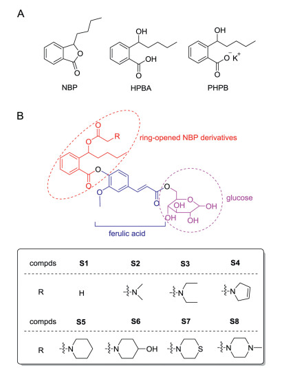 Figure 1. (A) The chemical structures of NBP, HPBA and PHPB. (B) The design and structures of target compounds S1-S8.It has been reported that oxidative stress plays an important role in cerebral ischemia/reperfusion (I/R) injury [14]. High levels of reactive oxygen species (ROS) can destroy cellular macromolecules, leading to autophagy, apoptosis and necrosis [15]. Therefore, inhibition of ROS production and/or up-regulation of endogenous antioxidant systems in vivo is one of the important strategies for designing anti-ischemic drugs. Ferulic acid (FA) is one of the main active ingredients of Chinese herbal medicines such as Angelica, Chuanxiong and Awei, and possesses a large variety of pharmacological activities, including inhibition of ROS, antioxidation, anti-inflammatory, and anti-platelet aggregation, etc. [16]. Importantly, FA can be used alone or as a linker between two active molecules to enhance the therapeutic effects of cardiacerebrovascular diseases [17, 18].