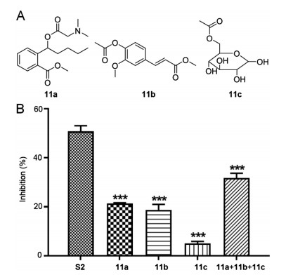 Figure 2 (A) The structures of compounds 11a-c. (B) Inhibition of ADP-induced rabbit platelet aggregation by 11a-c alone or in combination in vitro. Rabbit platelet suspensions were pre-incubated with tested compounds (0.1 mmol/L) at 37 ℃ for 5 min, followed by addition of ADP (10 μmol/L). Data are expressed as the mean ±SD of each compound from six independent experiments. ***P < 0.001 vs. S2.