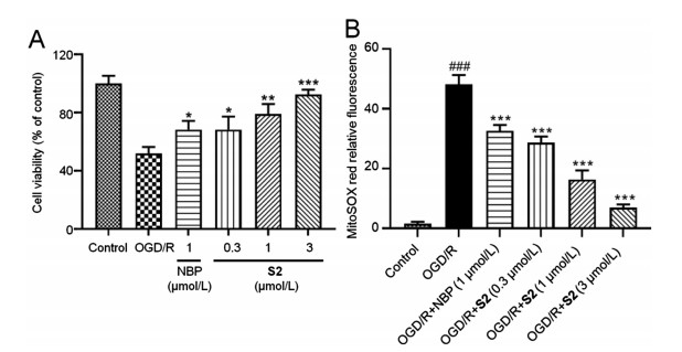 Figure 3. S2 protected primary cultured cortical neurons against OGD/R-induced injury. (A) Cell viability determined by MTT assay. (B) Mitochondrion ROS generation determined by staining with MitoSOX Red. Data are presented as mean ± SD from three independent experiments. *P < 0.05, **P < 0.01, ***P < 0.001 vs. OGD/R group; ###P < 0.001 vs. control group.We then assessed the aqueous solubility of S2 at 25 ℃ by HPLC and found that S2 (16.70 ± 1.33 mg/mL) was approximately 30-fold more soluble than NBP (0.54 ± 0.21 mg/mL) in water, which is probably attributable to the water-soluble glucose and amine moieties in S2.
