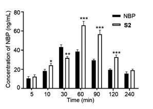 To compare the brain distribution between S2 and NBP, we conducted another assay in mice. After intravenous administration of S2 or NBP (25 mg/kg), the mice were sacrificed at 5, 10, 30, 60, 90, 120 and 240 min (n = 3), and the brain samples were then analyzed to determine the concentrations of NBP. As shown in Fig. 4, the concentrations of NBP in brain produced by S2-treatment or NBPtreatment gradually increased and then declined. And the amounts of NBP in the brain from S2 were greater than that from NBP alone in all time points except at 30 min, suggesting that S2 may more smoothly pass through BBB to release active NBP in the brain.