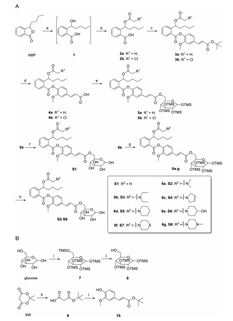 The synthetic routes of target compounds S1-S8 were depicted in Scheme 1A. Given that the R- and S-NBP show almost comparable activities and NBP in market is racemic, for simplicity, we used (R/S)-NBP as starting material. (R/S)-NBP was ring-opened under basic conditions to generate hydroxyl intermediate 1, which was directly treated with acetyl chloride or chloroacetyl chloride to give esters (R/S)-2a or -2b. The two esters were then condensed with tert-butyl ferulate 10 in the presence of N, N'-dicyclohexyl carbodiimide (DCC) and 4-dimethylaminopyridine (DMAP) to form conjugates (R/S)-3a and -3b, followed by removal of the tert-butyl group with trifluoroacetic acid (TFA) to afford acids (R/S)-4a and -4b. Subsequently, they were condensed with trimethylsilyl (TMS)- protected D-(+)-glucose 8 to offer D-(+)-glucose-6-OH esters 5a and 5b (each as epimeric mixture). The TMS groups in 5a were removed by using TFA to yield the target compound S1 as epimeric mixture. Compound 5b was reacted with dimethylamine, diethylamine, 2, 5-dihydro-1H-pyrrole, piperidine, 4-hydroxypiperidine, thiomorpholine and 1-methylpiperazine, respectively, under alkaline conditions to generate amines 6a-g. The TMS groups in 6a-g were then removed with TFA to provide the target compounds S2-S8 (each as epimeric mixture).