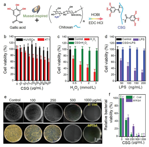 Figure 1. Characterization of CSG molecule. (a) Synthetic route for CSG molecules; (b) cytotoxicity of CSG on HUVECs and 4T1 cancer cells, respectively; quantitative detection of HUVECs viability when treated with H2O2 (c) and LPS (d); antibacterial activity of CSG against E. Coli and MRSA: (e) digital photographs and (f) the corresponding calculated relative antibacterial ratio.Another mortal threat during postoperation period is bacterial infection, thus conventional Gram-negative Escherichia coli (E. coli) and Gram-positive methicillin-resistant Staphylococcus aureus (MRSA) were both employed as model bacteria to test the antibacterial efficacy of CSG molecule before its further in vivo implantation. After incubated with CSG aqueous solution for 24 h, viable bacteria counts were estimated by the spread plate method and the plates were incubated at 37 ℃ for 24 h followed with colonies counting. As shown in Figs. 1e and f, catechol-conjugated CSG exhibited a dose-dependent bacterial-inhibiting ability. In detail, the minimum concentration of CSG for completely inhibiting E. coli and MRSA was around 250 and 500 μg/mL, respectively. Therefore, CSG molecule still retain considerable antibacterial ability from CS and GA which was necessary for in vivo anti-infection applications.