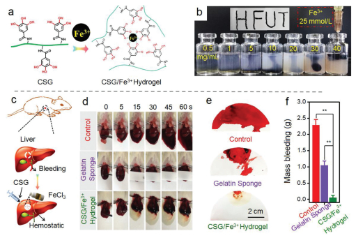Figure 2. Characterization of CSG/Fe3+ hydrogel: (a) well-reported catechol-Fe3+ interfacial bond dynamics; (b) photographs of CSG/Fe3+ hydrogel and depiction of HFUT (abbreviation for Hefei University of Technology); (c) schematic depiction of building rat liver bleeding model; (d) partial view of the bleeding rat liver at predetermined time; (e) typical bloody filter papers and (f) weight of blood loss for various treated groups. ** P < 0.01.After building a rat liver bleeding model (Fig. 2c), CSG/Fe3+ hydrogel (in situ formed by subsequent injection of CSG and Fe3+ solutions) and clinically-used gelatin sponge were both employed for comparing their hemostatic abilities. As shown in Fig. 2d, the time to achieve efficient hemostasis of CSG/Fe3+ hydrogel (around 5 s) is much shorter than gelatin sponge (around 30 s), indicating the better hemostatic performance of as-prepared CSG/Fe3+ hydrogel. After bleeding from the liver cut for 60 s (the time for stopping bleeding without any treatment: control group), the CSG/Fe3+ hydrogel treated group showed significantly reduced blood loss from either the perspective of bleeding area (Fig. 2e) or weight (Fig. 2f).