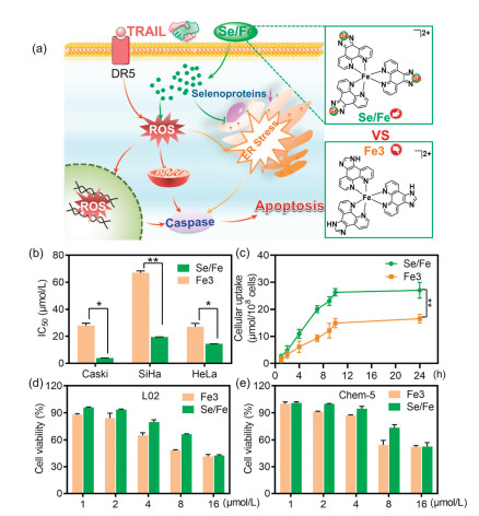 Figure 1 Cytotoxicity of Se/Fe and Fe3 complexes to cervical cancer cells and normal cell lines. (a) Scheme of potent anticancer activities induced by the co-treatment of Fe complexes and TRAIL. (B) Cytotoxic effects of Fe complexes on the cervical cancer cells (Caski, SiHa, HeLa). The cervical cancer cells were exposed to Se/Fe or Fe3 with certain concentration at 37 ℃ for 24 h. (c) Cellular uptake of Fe complexes in HeLa cells. Fe complexes (32 μmol/L) were added into HeLa cells for 24 h. (d, e) Toxicity of Fe complexes to normal cell lines (L02, Chem-5). The normal cells were dealt with Fe complexes at various concentrations for 48 h. Asterisk with ** represents statistical difference at the P < 0.01 level.