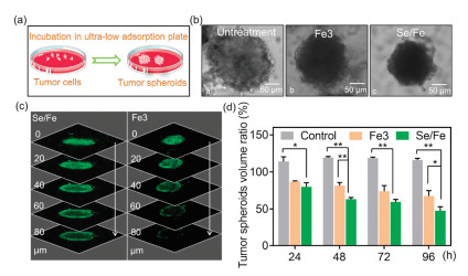 Figure 2 Inhibitory effect and penetration capacity of Se/Fe and Fe3 complexes towards HeLa tumor spheroid. (a) HeLa tumor spheroids model. (b) Optical imaging of HeLa tumor spheroids before/after treatment with Fe complexes for 48 h. (c) Penetration capacity analysis of Fe complexes towards HeLa tumor spheroids. The spheroids were incubated with Se/Fe or Fe3 complexes for 12 h. The tumorscanning fluorescent microscope were taken every 20 μm section from the top to the middle of tumor spheres. (d) Inhibitory effect of Fe complexes towards HeLa tumor spheroids. The complexes were used at the concentration of 32 μmol/L. Asterisks (*/**) denote significantly different P < 0.05 level and P < 0.01 level respectively.