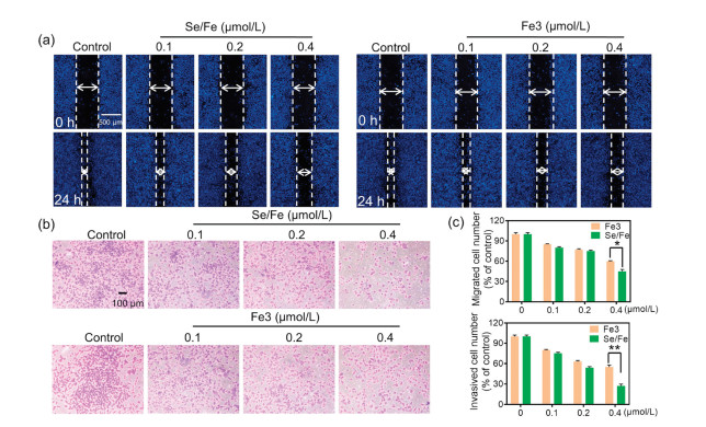 Figure 3. The effects of Fe complexes on the migration and invasion capabilities of HeLa cells. (a) Anti-migration assay of Fe complexes on HeLa cells. (b) Anti-invasion assay of Fe complexes on HeLa cells. (c) The migration and invasion of HeLa cells in quantitative analysis with the treatment of Fe complexes. * and ** represent statistically different at the P < 0.05 level and P < 0.01 level respectively.As an essential element, selenium (Se) incorporated into proteins (selenoprotein) plays crucial roles for the health of humans, animals and some other microorganisms [30, 31]. To fully understand its interactions with tumor cells, we then explored the effects of both complexes on the expressions of some selenoproteins in HeLa cells using qPCR assay and western blotting analysis. From quantitative PCR analysis, it was demonstrated that Se/Fe complex could more effectively down-regulate the expressions of SELS, GPX4, SELO in HeLa cells when treated for 12 h while Fe3 complex just slightly down-regulating GPX4 and SELO (Fig. 4a). The higher cellular uptake of Se/Fe complex and its possible metabolisms into selenium-containing amino acids which may interfere with the synthesis of selenoproteins endow Se/Fe complex with greater effects on selenoproteins than that of Fe3 complex. In addition, western blotting analysis indicated that Se/Fe complex could more significantly induce the down-regulation of those three selenoproteins when cells treated for 24 h compared to untreated group (Fig. 4b). However, it was found that Fe3 complex showed no effect on GPX4 expression and up-regulated SelO expression (Fig. 4b), which are inconsistent with that of PCR analysis. These phenomena may be attributed to the different time points of those two assays and the complicated interactions among selenoproteins. The detailed underlying mechanisms still need further studies. It is known that SELS locating in endoplasmic reticulum affects the ER-associated degradation of misfolded protein [32]. SelS silence enhanced endoplasmic reticulum (ER) stress induced by hydrogen peroxide or tunicamycin to cause cell apoptosis [33]. GPX4 as one of selenocysteine-containing glutathione peroxidases exhibited anti-apoptotic capability through reducing damaging ROS [34-36]. Meanwhile, SELO located in mitochondria with C-X-X-U (where C is cytosine, X is any nucleotide, and U is uridine) motif could serve as redox-active mitochondrial selenoprotein for redox control [37]. All these evidences indicated that our developed Se/Fe complex could shape the intracellular redox state and induce ER stress to damage tumor cells (HeLa) via inhibiting the expressions of related selenoproteins.