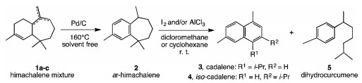 The α-, β-, γ-himachalene mixture was first converted to ar-himachalene 2 by various dehydrogenation agents (selenium, Ni, Pd/C, chloranil (tetrachloro-1, 4-benzoquinone) [35-40]. A solvent-free procedure, using catalytic amount of Pd/C (0.025 wt%) at 160 ℃ for 12 h, was found to afford ar-himachalene 2 with a quantitative yield (Scheme 1). The process was further developed and applied on a multi-gram scale (up to 1 kg), demonstrating the industrial feasibility of the transformation.