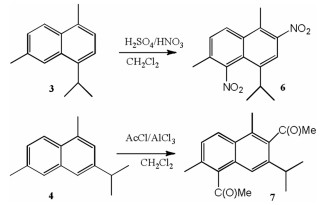 Structural assignment of 3 was confirmed by aromatic nitration with HNO3/H2SO4 (Scheme 2). Among various products, the dinitro derivative 6 was isolated with 65% yield after crystallization from EtOAc. The cadalenic structure 6 was confirmed by X-ray diffraction analysis of selected crystals, the data being identical to those previously reported (P1, triclinic space group, CCDC: 887079 [47].