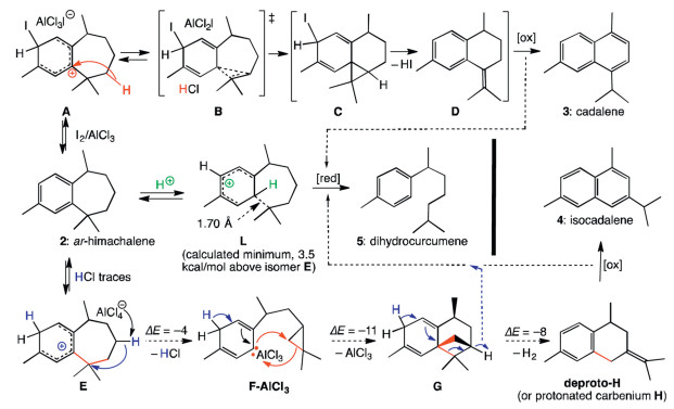 In cyclohexane, traces of HCl, e.g., resulting from the reaction of traces of water with AlCl3, would trigger the reversible formation of the cyclohexadienylium salt E. Deprotonative cleavage of the benzylic C1-C11 bond of E would then give the spiro-cyclobutane G, via a transient cyclohexadiene-cyclopropane-carbenoid intermediate F-AlCl3 (stabilized form of the free carbene F: see exploratory DFT calculations in Supporting information, and references [51-53] for Al-NHC complexes). Under the synergic driving forces of steric relief and aromaticity recovery, dehydrogenation of G would then lead to the exocyclic alkene deproto-H or/via the corresponding tertiary carbocation H. After isomerization to the π-conjugated endocyclic alkene, the dihydronaphthalene bicycle would readily undergo oxidative aromatization to iso-cadalene 4, mediated by either air or carbenium L. This carbenoid route is also in line with the long-evidenced carbene intermediates in thermal rearrangements of polycyclic aromatics [54, 55], and in particular the related thermal rearrangement of azulenes to naphthalenes [56, 57].