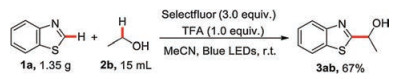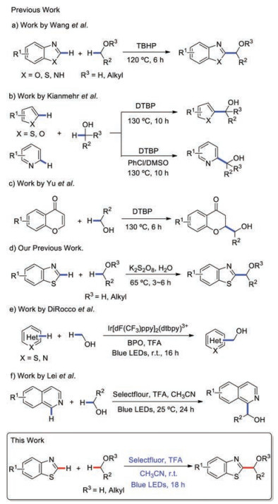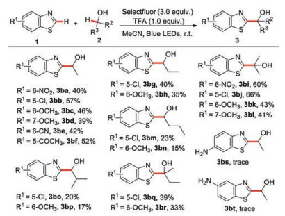 In conclusion, we have developed a mild and convenient method for the C2-hydroxyalkylation of 2H-benzothiazoles with diverse alcohols, which was mediated by selectfluor under the blue LEDs irradiation at room temperature. This hydroxylkylation reaction tolerates a wide range of functional groups. Besides, ethers were also compatible in this reaction, leading to corresponding C2 ether-substituted 2H-benzothiazoles with high regioselectivity. As such, we expect that this new strategy can be applied to medicinal and agricultural chemicals studies in the future.