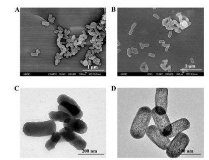 In this study, HMSNRs and mesoporous silica nanorods (MSNRs) were prepared firstly. CTAB (400 mg), ammonium hydroxide (2 mL) and 1-butanol (30 μL) were dissolved into deionized water (95 mL) under ultrasonic condition for 15 min. TEOS (2 mL) was then added into the mixture under stirring at room temperature. After 6 h, the white precipitate (MSNRs-CTAB) was obtained by filtration. The MSNRs-CTAB was then calcined in muffle at 550 ℃ for 6 h to remove CTAB. The product was MSNRs. The morphology and size of MSNRs were detected by scanning electron microscope (SEM). The internal structure was observed by transmission electron microscope (TEM).