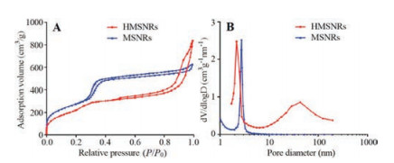 The mesoporous structures of MSNRs and HMSNRs were detected by nitrogen adsorption-desorption isotherms. As shown in Fig. 3A, the adsorption curve of MSNRs flatten out when P/P0 > 0.4. This result meant that the adsorption reached saturation when P/P0 > 0.4. By contrast, the adsorption curve of HMSNRs steepened when P/P0 > 0.8. This result meant that the nitrogen adsorption capacity rapidly increased, which might be caused by the hollow structures of HMSMRs. The pore sizes of MSNRs and HMSNRs were calculated by a BJH method. As shown in Fig. 3B, the pore diameter of MSNRs was 2.72 nm. The pore diameterof HMSNRs was 6.05 nm. But there were two peaks in the curve of the HMSNRs' pore diameter. One was 2.17 nm and the other was 43.10 nm. The peak of 2.17 nm was the mesoporous structures and the peak of 43.10 nm was the hollow structures. So, the pore diameter of HMSNRs was 2.17 nm. The specific surface areas of MSNRs and HMSNRs were calculate by a BET method and were 1019.64 m2/g and 850.47 m2/g, respectively. The specific surface area of MSNRs was larger than the specific surface area of HMSNRs, because MSNRs had more and longer channels.The pore volumes of MSNRs and HMSNRs were calculate by a BJH method and were 1.03 cm3/g and 1.27 cm3/g. The pore volume of HMSNRs was bigger than the pore volume of MSNRs.
