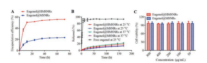 Figure 4. (A) The encapsulation efficiency of eugenol@MSNRs and eugenol@HMSNRs at different time. (B) The release profiles of eugenol@MSNRs and eugenol@HMSNRs and free eugenol. (C) Effect of eugenol@MSNRs and eugenol@HMSNRs with different concentrations on viability of human HSF cells. The mean ± SD is shown (n = 3).The release profiles of eugenol from eugenol@MSNRs and eugenol@HMSNRs were shown in Fig. 4B. Both eugenol@MSNRs and eugenol@HMSNRs can release fragrances slowly. The release rate of eugenol from eugenol@MSNRs was slightly slower than that of eugenol from eugenol@HMSNRs. This might be caused by two reasons: (1) Eugenol@MSNRs encapsulated less eugenol; (2) The specific surface area of eugenol@MSNRs was larger. Besides, the release rate of eugenol at 37 ℃ was slight faster than that of eugenol at 25 ℃. This might be due to the fact that as the temperature increased, the thermal motion of eugenol was accelerated, which in turn accelerated the diffusion of eugenol.