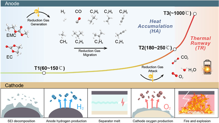 As one of the most flammable components in LIBs, electrolytes have an important impact on the thermal runaway process of batteries, especially in the HA stage. The specific causes are as follows: Firstly, organic carbonates themselves have low flash and boiling points and are usually highly volatile and flammable, and these solvents are prone to cause fires when exposed to air [32,33]. Secondly, conventional electrolytes are chemically unstable. LiPF6 is sensitive to moisture and decomposes easily above 60 ℃, where it can produce the strong Lewis acid phosphorus pentafluoride (PF5), and PF5 reacts with organic solvents to produce HF and other reducing gases [34-36]. As the temperature increases above 100 ℃, the carbonate solvents come into direct contact with the lithiated anode and begin to undergo more intense redox reactions. This is typically manifested by a steadily increasing heating slope (>1 ℃/s) in ARC tests or a significant exothermic peak on DSC results [3], corresponding to the characteristic T2 temperature of the TR process. In addition, the organic solvent decomposes itself at 200 ℃ to produce CO2 and H2O [37-39]. Thirdly, the electrolyte is unstable to the interface. The narrow electrochemical window of the electrolyte itself makes it prone to side reactions at the cathode and anode, while the actual SEI formed by the conventional carbonate electrolyte is fragile and unstable, which leads to inhomogeneous lithium deposition [40]. The generated lithium dendrites eventually puncture the separator, resulting in direct cathode-anode contact and the subsequent triggering of thermal runaway, which corresponds to a T3 temperature. Lastly, it promotes the accumulation of flammable gases. During the battery HA stage, some reducing gases (e.g., H2, CO, CH4, C2H4, and C2H6) are continually produced, which migrate inside the battery and attack the cathode crystals, especially the gases containing unsaturated bonds, triggering the release of more oxygen at high temperatures and generating large amounts of heat and gases [41].