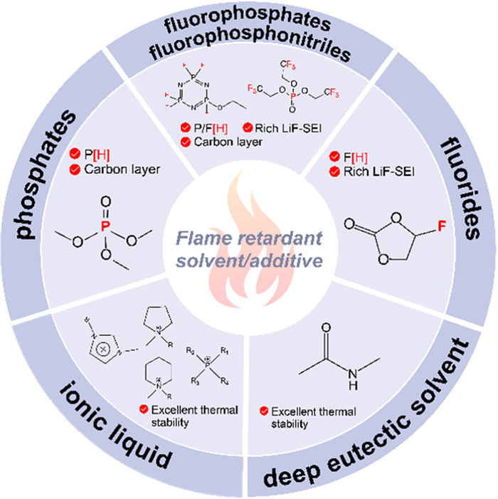 As mentioned above, the development of non-flammable liquid electrolytes that are both flame-retardant and battery-grade safe is of paramount importance. It is widely acknowledged that the design of electrolytes is a complex, systematic project. Consequently, the introduction of flame-retardants has an impact on all aspects of battery performance, including thermal stability, electrochemical stability and interfacial stability. This section provides an overview of the most commonly used flame-retardant solvents, including phosphates, fluorides, fluorosphates and fluorophosphonitriles, ionic liquids, and deep eutectic solvents (Fig. 2). Finally, the influence of a particular category of flame-retardant solvents on the battery system is elucidated, along with proposals for optimization strategies.