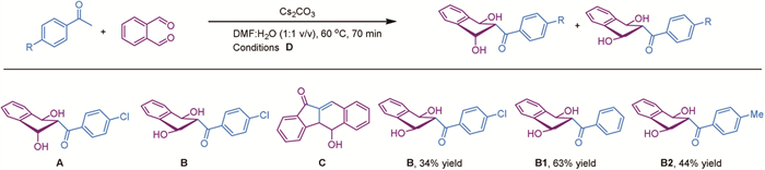 Entry Variation from the standard condition Yield (%) 3 4 1 None 88 86 2 In the absence of water 55 35 3 THF instead of DMF 41 33 4 K3PO4 instead of Cs2CO3 38 19 5 KOH instead of Cs2CO3 42 10 6 rt instead of 60 ℃ 75 73 7 1.2 equiv. of Cs2CO3 83 81 a Reaction conditions A: The reaction was carried out with 0.2 mmol of acetophenone, 0.42 mmol of o-phthalaldehyde, and 0.3 mmol of Cs2CO3 in 0.2 mL of solvent (DMF:H2O 1:1, v/v) at 60 ℃ for 24 h. All reported yields are isolated yields. -