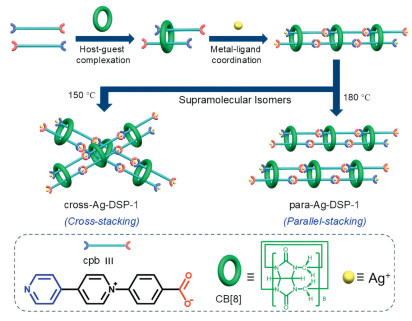 Figure 1  Coordination-driven assembly of supramolecular isomers of double-stranded polyrotaxanes with different lattice stacking modes, cross-Ag-DSP-1 (cross-stacking) and para-Ag-DSP-1 (parallel-stacking) through metal-ligand coordination between a doubly threaded [3]pseudorotaxane linker, (cpb)2—CB8) and Ag+ ion.