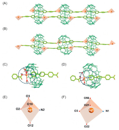 Figure 2  Double-stranded polyrotaxane structural units in cross-Ag-DSP-1 (A, C, E) and para-Ag-DSP-1 (B, D, F): molecular structures of double-stranded polyrotaxane chains (A, B), Coordination spheres (C, D) and geometric conformations (E, F) of Ag+ nodes (Ag1).