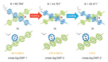 Figure 4.  The heating-triggered irreversible SCSC transformation of cross-Ag-DSP-1: A transformation from cross-Ag-DSP-1 within 150–260 K to cross-Ag-DSP-2 at 270–300 K with a remarkable phase transition; foramtion of cross-Ag-DSP-2′ which has no signigicant change from cross-Ag-DSP-2 after recooling to 170 K.