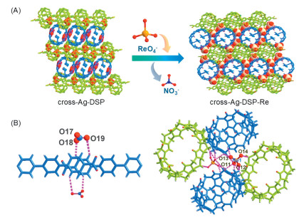 Figure 6  Structure transformation from cross-Ag-DSP to cross-Ag-DSP-Re triggered by anion exchange between NO3- and ReO4-. (A) Lattice packing diagrams before and after anion exchange. Hydrogen interactions of NO3- (B) and ReO4- (C) with surrounding C—H groups.