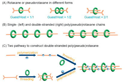 Scheme 1.  Poly(pseudo)rotaxanes based on (pseudo)rotaxane units: (A) Rotaxanes and pseudorotaxanes in different mechanically-interlocked forms with varying host-guest ratios. (B) Schematic diagram of single-stranded and double-stranded poly(pseudo)rotaxane chains. (C) Two possible pathways, i.e., polymerization followed by threading and prethreading prior to polymerization, used to construct double-stranded poly(pseudo)rotaxane chains.