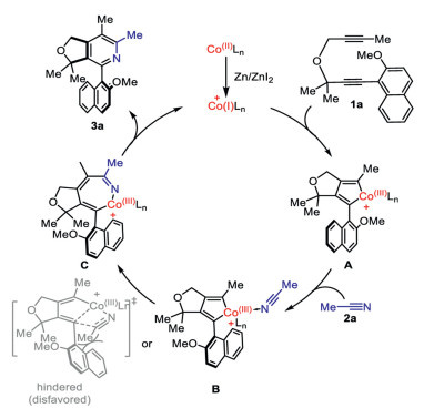 From the above results and previous transition metal- catalyzed [2 + 2 + 2] cycloaddition reports [64-67], the proposed mechanisms for this cobalt-catalyzed [2 + 2 + 2] cycloaddition of the diynes 1 with nitriles 2 are depicted in Scheme 6. Initially, the cationic Co(Ⅰ) species is generated in-situ from the reduction of Co(Ⅱ) with zinc powder and ZnI2 before it was coordinated with the diyne 1a, followed by cyclization to form the cationic Co(Ⅲ) intermediate A [68-73]. Subsequently, acetonitrile 2a coordinated with A to give the cationic Co(Ⅲ) complex B. Complex B undergoes migratory insertion to generate the Co(Ⅲ) intermediate C, followed by reductive elimination to give the final product 3a while the reactive cationic Co(Ⅰ) species was released for the next catalytic cycle. Due to the steric hindered interaction between the aryl group in A and the methyl group in acetonitrile 2a, cyano insertion into naphthyl alkenyl part is unfavourable.