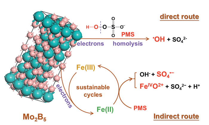 Molybdenum pentaboride (Mo2B5) has great potential in enhancing Fenton-like reactions [15]. Boron atom has a specific electron configuration (1s22s22p1) [16], the outermost layer of boron does not reach a sTable 8-electron configuration and is thus in an electron-deficient state. This electron deficient property endows boron with Lewis acidity, allowing it to accept electron pairs and form coordination adsorption with negatively charged groups, such as the O—O or S-O of PMS molecule. In addition, the electronic configuration of molybdenum is [Kr]4d55s1, with abundant D-orbital electrons that can flexibly undergo oxidation state changes from +2 to +6. The molybdenum atom of Mo2B5 usually exists in the +3 and may directly provide electrons for initiating Fe(Ⅲ) reduction as an electron donor [17]. Meanwhile, the boron and molybdenum in lower oxidation states on Mo2B5 surfaces facilitate efficient electron transfer to ferric species (e.g., Fe3+ and FeOH2+) [18]. This electron donation process may accelerate ferrous ions regeneration, thereby enhancing the kinetics of the rate-determining step in Fenton-like catalytic cycles [19]. Therefore, Mo2B5 also has great potential in indirectly activating PMS to produce ROS, and meanwhile, low valence molybdenum and boron form a co-catalyst with dual reduction sites for promoting Fe(Ⅲ) reduction. In addition, Mo2B5, a cost-effective metal boride composed of abundant natural elements, is typically prepared by straightforward solid-phase reactions involving molybdenum metal and amorphous boron [20]. Thus, Mo2B5 is a promising co-catalyst with high conductivity and cost-effectiveness of dual reduction sites to facilitate direct and indirect activation of PMS [7,21,22].