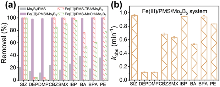Figure 4.  (a) Efficiencies and (b) kobs for degrading multiple pollutants in the Mo2B5/Fe(Ⅲ)/PMS system.