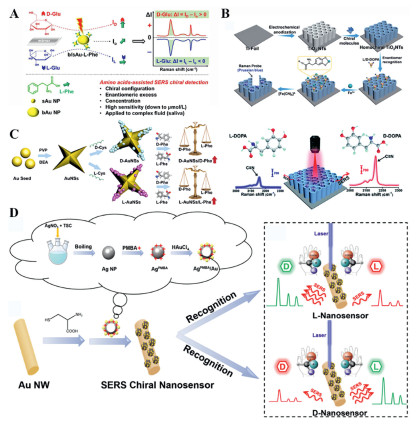 Figure 3  (A) SERS-based mirror-image for enantiomeric discrimination. Copied with permission [93]. Copyright 2022, the American Chemical Society. (B) Fabrication of a homochiral SERS substrate and PB generation. SERS-based enantiomeric recognition and qualification of DOPA enantiomers via the PB signal at 2158 cm−1. Copied with permission [94]. Copyright 2022, the Royal Society of Chemistry. (C) Schematic illustration of the synthesis process and enantioselective recognition of chiral D/L-AuNSs. Copied with permission [95]. Copyright 2024, the Elsevier. (D) Schematic illustration of the SERS chiral nanosensor. Copied with permission [96]. Copyright 2025, the American Chemical Society.
