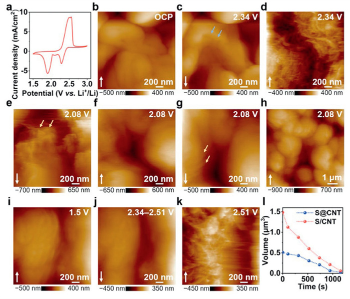 Figure 2  (a) The cyclic voltammetry profile of S/CNT electrode with a scan rate of 1 mV/s. In situ AFM images obtained on S/CNT electrode at different potentials of (b) OCP, cathodic (c, d) 2.34 V, (e–h) 2.08 V and anodic (i) 1.5 V, (j) 2.34–2.51 V, (k) 2.51 V. The white arrows in the images represent the scanning direction. (l) Plots of the volume changes versus time during the decomposition process of discharged products on S@CNT and S/CNT electrode, respectively.