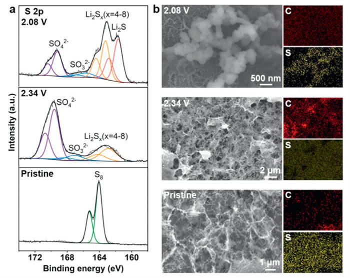 Figure 3.  Characterizations of S/CNT electrode disassembled from the cell. (a) XPS S 2p spectra of S/CNT electrode in the pristine stage and when discharging to 2.34 V and 2.08 V. (b) SEM and the corresponding EDS images of S/CNT electrode in the pristine stage and when discharging to 2.34 V and 2.08 V, respectively.