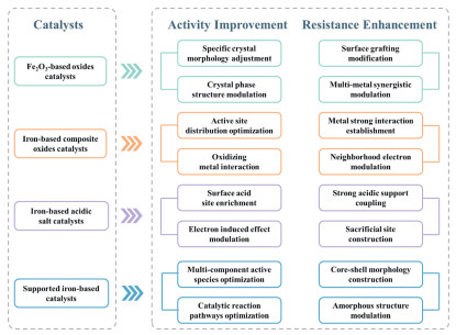 Figure 1.  Promotional strategies of catalytic activity improvement and anti-poisoning performance enhancement over iron-based metal oxide catalysts for NOx reduction.