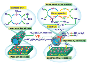 Figure 11.  Schematic illustration of activity/selectivity-promoted and SO2-resistant mechanisms over the m-TiO2@Fe2O3@Al2O3 monolith catalyst for NOx reduction. Reproduced with permission [107]. Copyright 2019, American Chemical Society.