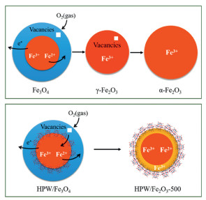 Figure 3.  Scheme of the phase transition inhibition of γ-Fe2O3 to α-Fe2O3 at 500 ℃ by HPW grafting. Reproduced with permission [30]. Copyright 2018, American Chemical Society.