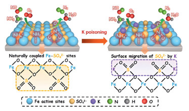 Figure 9.  Schematic illustration of the induced surface migration of SO42– by K poisoning and the proposed K resistance mechanism over TiO2-supported Fe2(SO4)3 catalysts for NOx reduction. Reproduced with permission [82]. Copyright 2021, American Chemical Society.