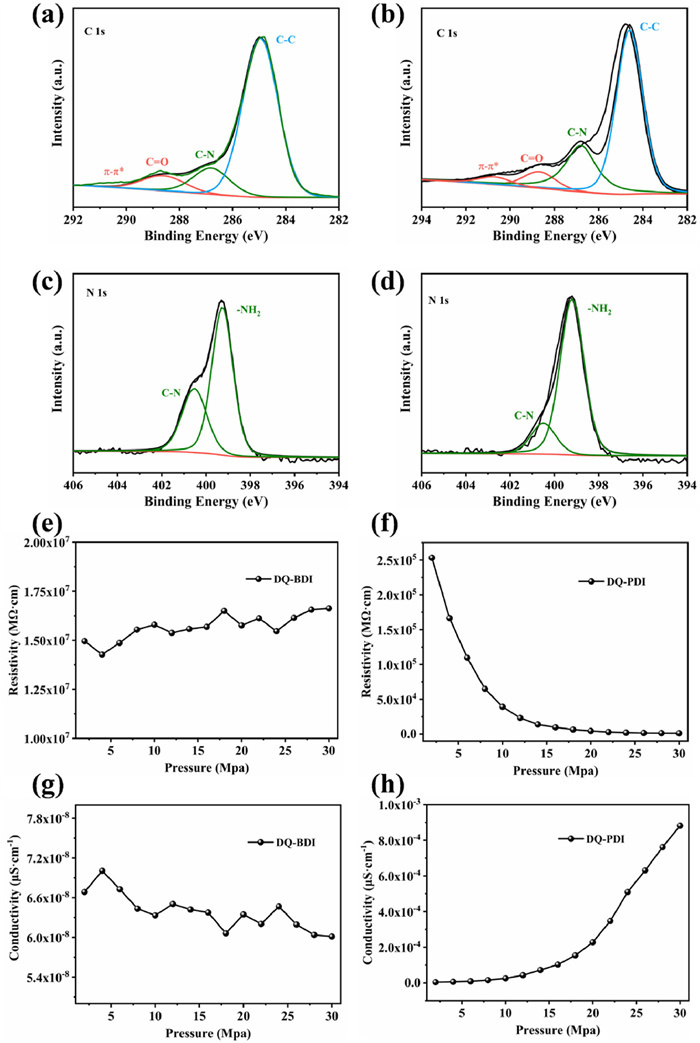Figure 2  XPS from C 1s in (a) DQ-BDI, (b) DQ-PDI. and N 1s in (c) DQ-BDI, (d) DQ-PDI. Resistivity of (e) DQ-BDI, (f) DQ-PDI and conductivity of (g) DQ-BDI, (h) DQ-PDI.