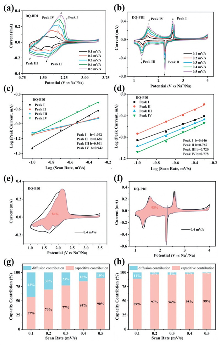 Figure 4  Cyclic voltammetry curves of (a) DQ-BDI and (b) DQ-PDI electrode at different scan rates. Plot of logi versus logν of (c) DQ-BDI and (d) DQ-PDI at a specific peak rate. Capacitance contribution of (e) DQ-BDI and (f) DQ-PDI electrode at 0.4 mV/s. Percentage of pseudocapacitance and ion diffusion capacitance in total capacity storage of (g) DQ-BDI and (h) DQ-PDI electrode.