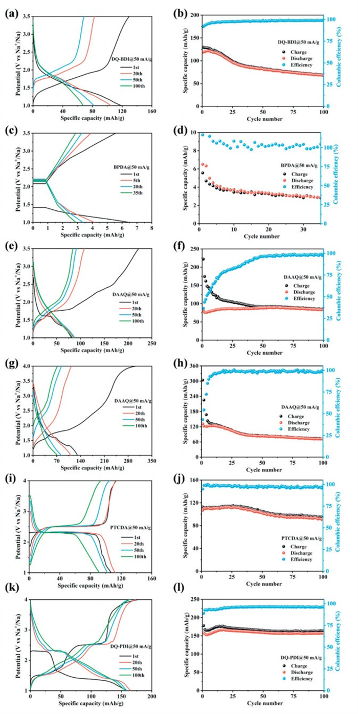 Figure 5  Charge/discharge curves of (a, b) DQ-BDI, (c, d) BPDA, (e-h) DAAQ, (i, j) PTCDA and (k, l) DQ-PDI.