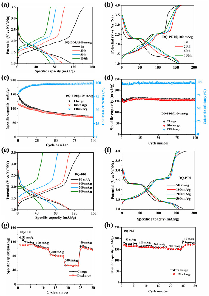 Figure 6  Charge-discharge graph of (a) DQ-BDI, (b) DQ-PDI and long cycle performance graph of (c) DQ-BDI, (d) DQ-PDI electrode at 100 mA/g current density. Charge and discharge curves at corresponding current density of (e) DQ-BDI and (f) DQ-PDI. Rate performance graph of (g) DQ-BDI and (h) DQ-PDI.