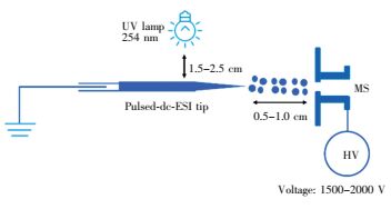 图 1. 实验装置示意图Figure 1. Schematic diagram of experimental setup. Pulsed-dc-ESI: pulsed directed current electrospray在实验前,需先将商业ESI源卸掉。实验中选择正离子模式进行检测,干燥气温度300℃; 干燥气流速2 L/min; 雾化器压力0 Psig; 毛细管电压1500 V; 毛细管出口电压175 V; 锥孔电压65 V; 八极杆电压750 V; 数据采集速率1 spectrum/s。二级信号采用Targeted MS/MS模式,保留时间0 min; 电荷数1;四极杆分辨率选择Narrow 1.3 m/z; 碰撞能量选择25 eV。
