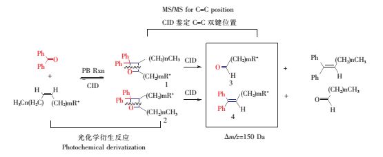 目前,已有两大类基于质谱的方法可鉴定出C=C的位置,但各有不足。第一种方法是在质谱分析前,使用化学衍生试剂使双键直接断裂,如臭氧裂解分析[16],或将C=C转化为官能基团(烷硫基化[17]或甲氧汞化作用[18]),这些官能团可以在离子化时裂解,或者通过低能碰撞诱导解离的方式发生断裂产生碎片离子。这种方法所需样品量大,若分析复杂样品,还需经过色谱分离。第二种方法通过不同气相诱导裂解的方式使双键或其周围化学键断裂。常见的方法有电荷转移裂解[19]、臭氧诱导解离[20]和自由基引发解离[21]。Poad等[22]构建了高压臭氧诱导解离装置,使用较多的臭氧,在一定程度上加快了反应的进行,可得到较多的可以用于确定C=C位置的产物离子。这些方法有望用于混合物分析,但通常需要搭建比较特殊的质谱仪器装置,而不是直接使用商业化的质谱装置,因此并不具有普适性。