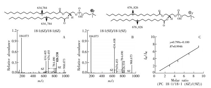 图 3 定量分析脂中不同双键双键异构体相对含量的原理:(A, B)PC 18:1/18:1(6Z)/(9Z)分别为1:1和7:1时PB产物的二级质谱图; (C)以I6/I9对异构体的浓度比(c6/c9)进行线形回归