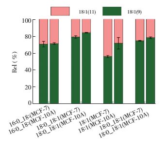 16:0_16:2(7, 9)16:1 676.46 412/438 16:1(9) 表 3 MCF-7和MCF-10A中4种卵磷脂PC 34:1、PC 36:1、PC 36:2、LPC 18:1对应的检测离子对的强度和双键异构体18:1中Δ9的相对含量