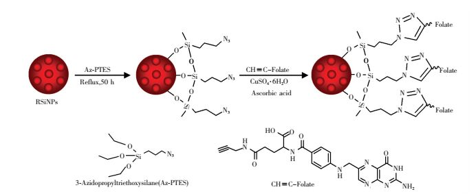 利用光学探针快速筛选和检测肿瘤细胞对疾病的早期诊断、早期治疗以及预后监测等具有重要的科学意义。自从在人卵巢癌细胞表面发现高表达的叶酸受体以来[1],这种叶酸特异性结合蛋白就被作为一种重要的标志分子而应用于肿瘤的早期诊断和靶向治疗[2~4]。传统的放射性标记技术可以定量检测癌变组织和正常组织中叶酸受体的含量[5, 6],但是该方法需要使用有害的放射性标记材料,且操作过程繁琐。近年来,荧光纳米探针因其高的灵敏度及可视化等特点,已经发展成为一种生物标记与成像的重要工具[7~10]。例如,叶酸功能化的量子点[11]、金纳米团簇[12]、碳点[13]、上转换纳米粒子[14]和荧光二氧化硅纳米粒子[15]等。其中,荧光二氧化硅纳米粒子不仅能够将大量的染料分子包裹在单个纳米颗粒中,而且其较大的表面积也易于进行生物分子的功能化修饰,从而大大提高检测的灵敏度[16, 17]。目前,这些叶酸功能化的荧光纳米探针基本上都是通过酰胺化反应制备的,其修饰过程需要复杂的活化过程,有可能会影响相应配体的生物学活性[18]。