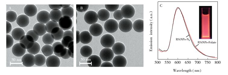 图 2 (A) RSiNPs-N3的透射电镜照片;(B)RSiNPs-Folate的透射电镜照片;(C)RSiNPs-N3和RSiNPs-Folate的荧光发射光谱(插图为300 nm紫外灯下RSiNPs-Folate的光学照片)。