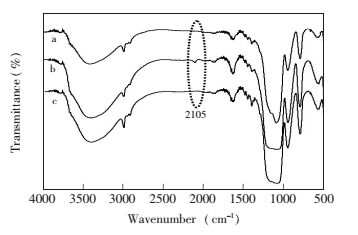 根据文献[27]报道的方法进行制备。首先将2.31 g (3-氯丙基)三乙氧基硅烷、20 mg四丁基溴化铵、3.12 g叠氮化钠、25 mL丁酮依此加入到100 mL三口瓶中,通入纯氮气,并加热回流50 h。反应结束后,利用硅藻土过滤并真空蒸发溶剂,将得到的产物溶于150 mL二氯甲烷中,用20 mL水洗涤两次,通过分液漏斗分离出有机相并用无水Na2SO4干燥,最后蒸发溶剂得到汁状产物(产率71%)。HR-MS (ESI, m/z): [M-H]-=246.13。1HNMR (CDCl3, 300 MHz): δ3.74 (q, 6H, —OCH2), 3.19 (t, 2H, —CH2N3), 1.73~1.51 (m, 2H, —CH2CH2N3), 1.16 (t, 9H, —OCH2CH3), 0.63~0.51 (m, 2H, —CH2Si)。
